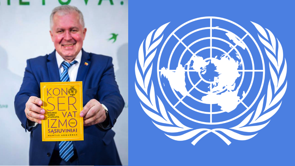 | Istorijos klastotojas, vienas iš įslaptintųjų A. Anušauskas ir Jungtinių Tautų logotipas. |