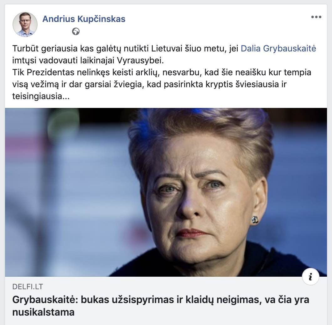 „Turbūt geriausia kas galėtų nutikti Lietuvai šiuo metu, jei Dalia Grybauskaitė imtųsi vadovauti laikinajai Vyrausybei“, - visuomeniniuose tinkluose paskelbė politikas.
