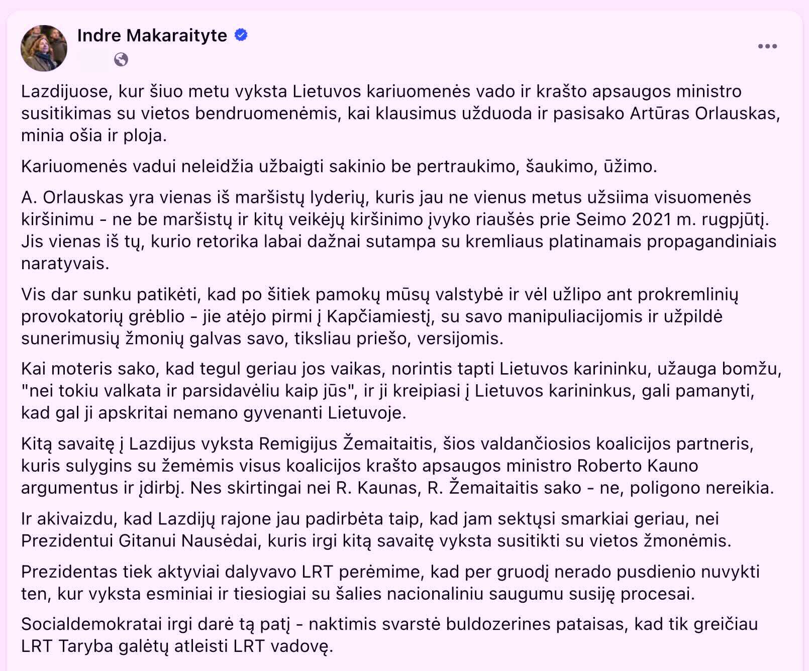 Ji taip pat perspėjo, kad „kitą savaitę į Lazdijus vyksta Remigijus Žemaitaitis, šios valdančiosios koalicijos partneris, kuris sulygins su žemėmis visus koalicijos krašto apsaugos ministro Roberto Kauno argumentus ir įdirbį“.