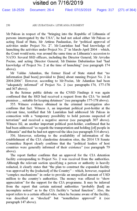 EŽTT sprendimas nurodo, kad nors Lietuvos vyriausybė visada neigė bet kokias netgi galimybes, kad Lietuvoje buvo slaptas CŽV kalėjimas, ir netgi Valstybės saugumo departamentas (VSD) pripažino, kad netgi JAV prašymas dalyvauti „kare prieš terorą“ buvo svarstomas tik teoriškai.