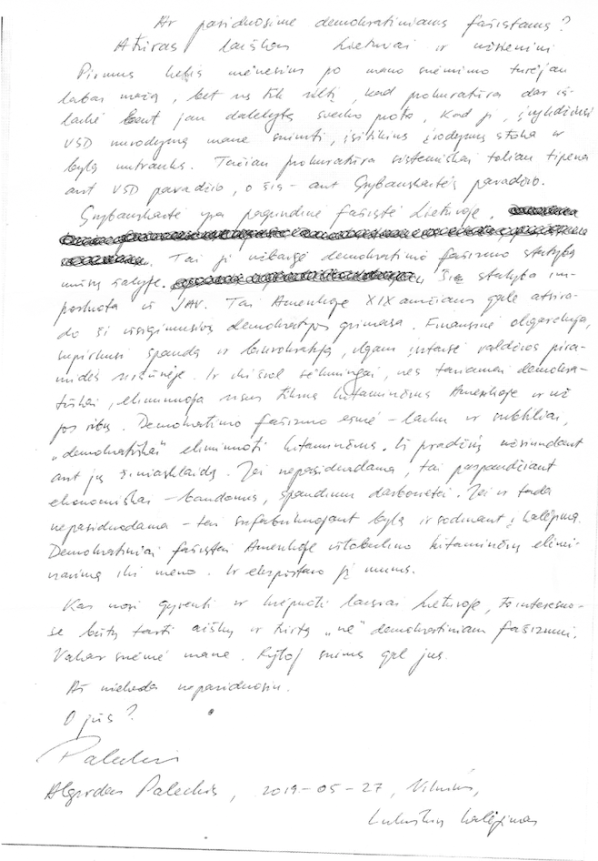 Daugiau negu pusmetį kalėjime be teismo laikomas šnipas Algirdas Paleckis parašė laišką „Ar pasiduosime demokratiniams fašistams“, kur išsakė savo neigiamą nuomonę apie dabartinę šalies vadovę Dalia Grybauskaitę bei Lietuvos teisėsaugą.