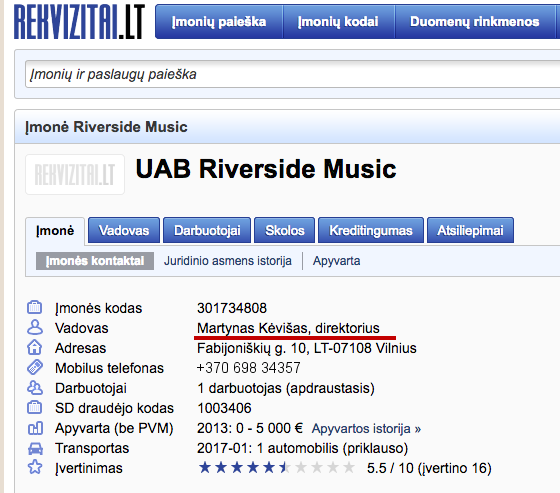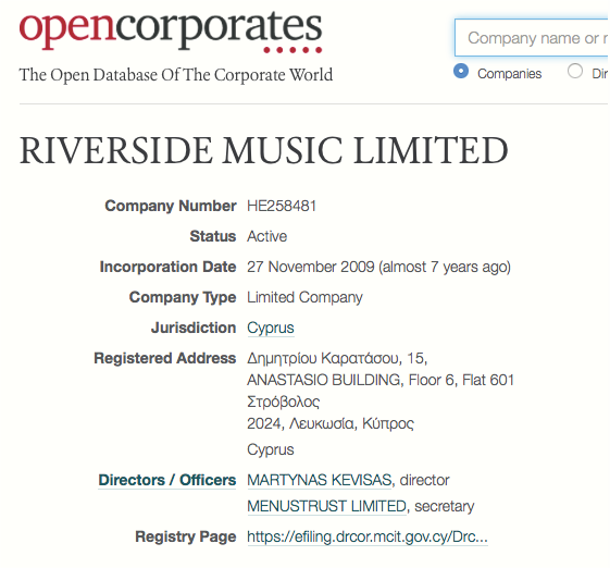 O ofšorinės Kipre veikiančios įmonės analogišku pavadinimu kaip ir Lietuvoje „RIVERSIDE MUSIC LIMITED“ direktorius taip pat yra G. Kėvišo sūnus M. Kėvišas.
