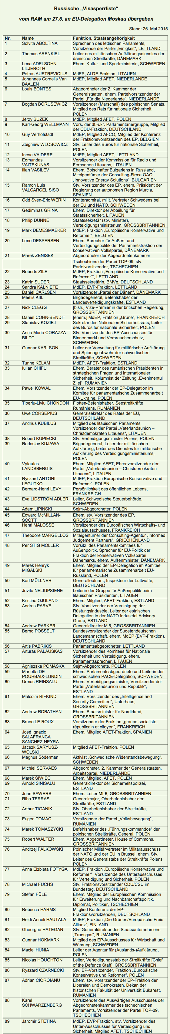 Suomijos žiniasklaidos gigantas Yle su visuomene pasidalino svarbiu gegužės 26 d. dokumentu: 89 svarbių asmenų iš ES sąrašu. Jame nurodytos pavardės žmonių, kurie Rusijoje nepageidaujami.