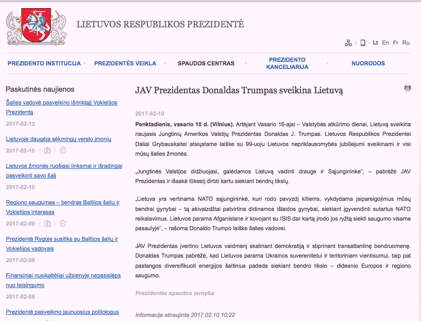 Vasario 10 d. Lietuvos Prezidentūra pranešė, kad „artėjant Vasario 16-ajai – Valstybės atkūrimo dienai, Lietuvą sveikina naujasis Jungtinių Amerikos Valstijų Prezidentas Donaldas J. Trumpas (Donaldas Džonas Trampas (Donald John Trump.) – red. pastaba) Lietuvos Respublikos Prezidentei Daliai Grybauskaitei atsiųstame laiške su 99-uoju Lietuvos nepriklausomybės jubiliejumi sveikinami ir visi mūsų šalies žmonės“.