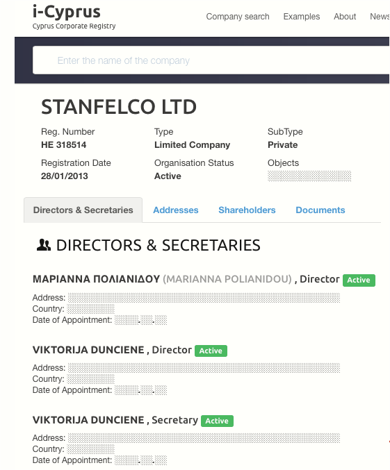 Dar viena įdomi detalė – STANFELCO LTD direktorė yra ne tik M. Polianidou, bet ir Viktorija Dunčienė, kuri vadovauja ir yra sekretorė bent 60 ofšorinių įmonių (bet tai jau kita istorija ir kitos sutartys, apie kurias bus galima pakalbėti vėliau).