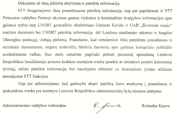 • kodėl iš biudžeto lėšų finansuojama valstybinė įstaiga LNOBT, vadovaujama generalinio direktoriaus Gintauto Kėvišo, minimą sutartį pasirašė su ofšorine Kipro įmone RIVERSIDE MUSIC LIMITED, kuriai vadovauja jo sūnus Martynas Kėvišas?
