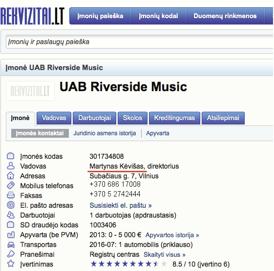 To paties pavadinimo firmų yra ne viena. Pradėkime nuo Lietuvoje registruoto UAB „RIVERSIDE MUSIC“ (įmonės kodas 301734808). Šios įmonės, kurioje dirba vienas darbuotojas, direktorius yra Teatro generalinio direktoriaus Gintauto Kėvišo sūnus Martynas Kėvišas.