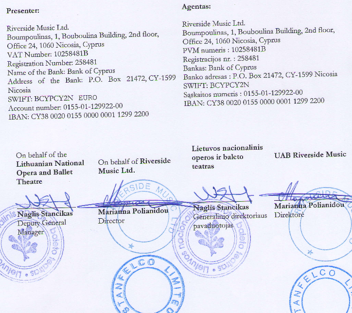 Teatro ir RIVERSIDE MUSIC LIMITED sutartį pasirašė Teatro generalinio direktoriaus pavaduotojas Naglis Stancikas, Lietuvai plačiau žinomas kaip buvęs banko „Snoras“ viceprezidentas, iš vienos pusės, ir Marianna Polianidou – iš kitos.