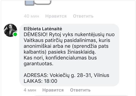 „Paaiškėjo, kas organizuoja puolimą prieš puikų režisierių Joną Vaitkų, tęsdamas darbą, pradėtą Sauliaus Sondeckio ir Donato Banionio apdergimu. Panelės Latėnaitės nurodytu adresu yra Arijaus Katausko viešųjų ryšių kontora. Arijaus interesas - pinigai. Kas moka ir kas užsakė Arijui šūdo drabstymo kampaniją, jei jos "žinutės" paraleliai platina ir kremliniai tinklalapiai, ir Delfis, ir Info? Dalinamės. Tegul žmonės žino tiesą!“, - teigia R. Janutienė.