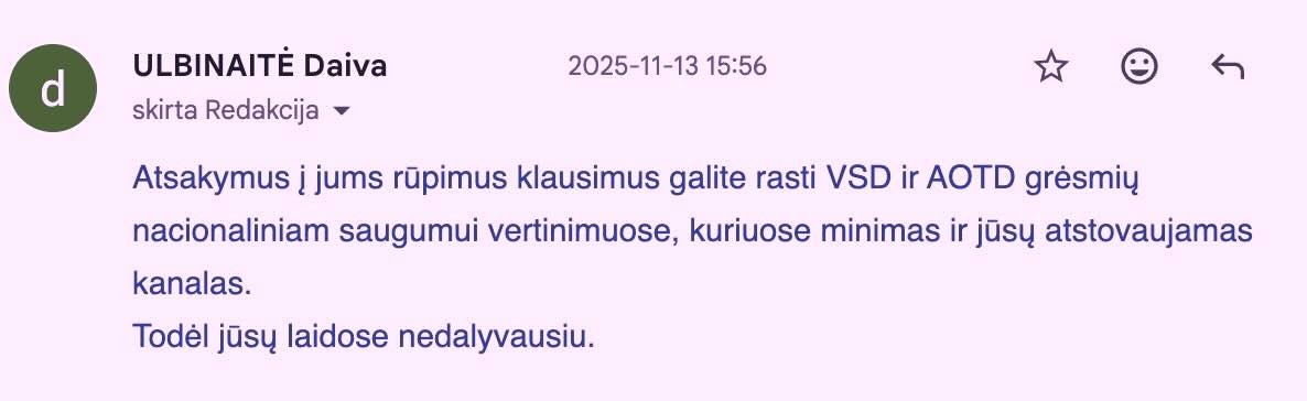 „Atsakymus į jums rūpimus klausimus galite rasti VSD ir AOTD grėsmių nacionaliniam saugumui vertinimuose, kuriuose minimas ir jūsų atstovaujamas kanalas. Todėl jūsų laidose nedalyvausiu“, - parašė D. Ulbinaitė.