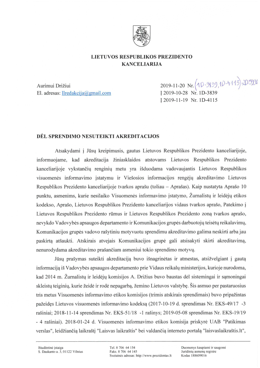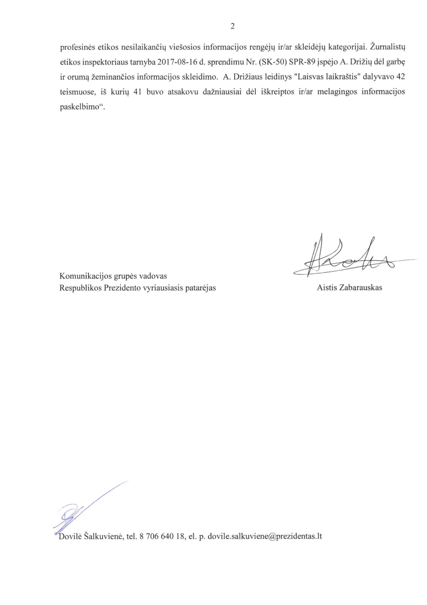 Prezidento Gitano Nausėdos vyriausias patarėjas Aistis Zabarauskas pasirašė pažymą, kad „Laisvo laikraščio“ redaktorius Aurimas Drižius niekada nebus įleistas į G.Nausėdos spaudos konferencijas, nes yra Lietuvos priešas: „atsižvelgiant į gautą informaciją iš Vadovybės apsaugos departamento prie VRM, kurioje nurodoma, kad 2014 m. Žurnalistų ir leidėjų etikos komisijos A.Drižius buvo baustas dėl sistemingai ir sąmoningai skleistų teiginių, kurie žeidė ir rodė nepagarbą, žemino Lietuvos valstybę“.