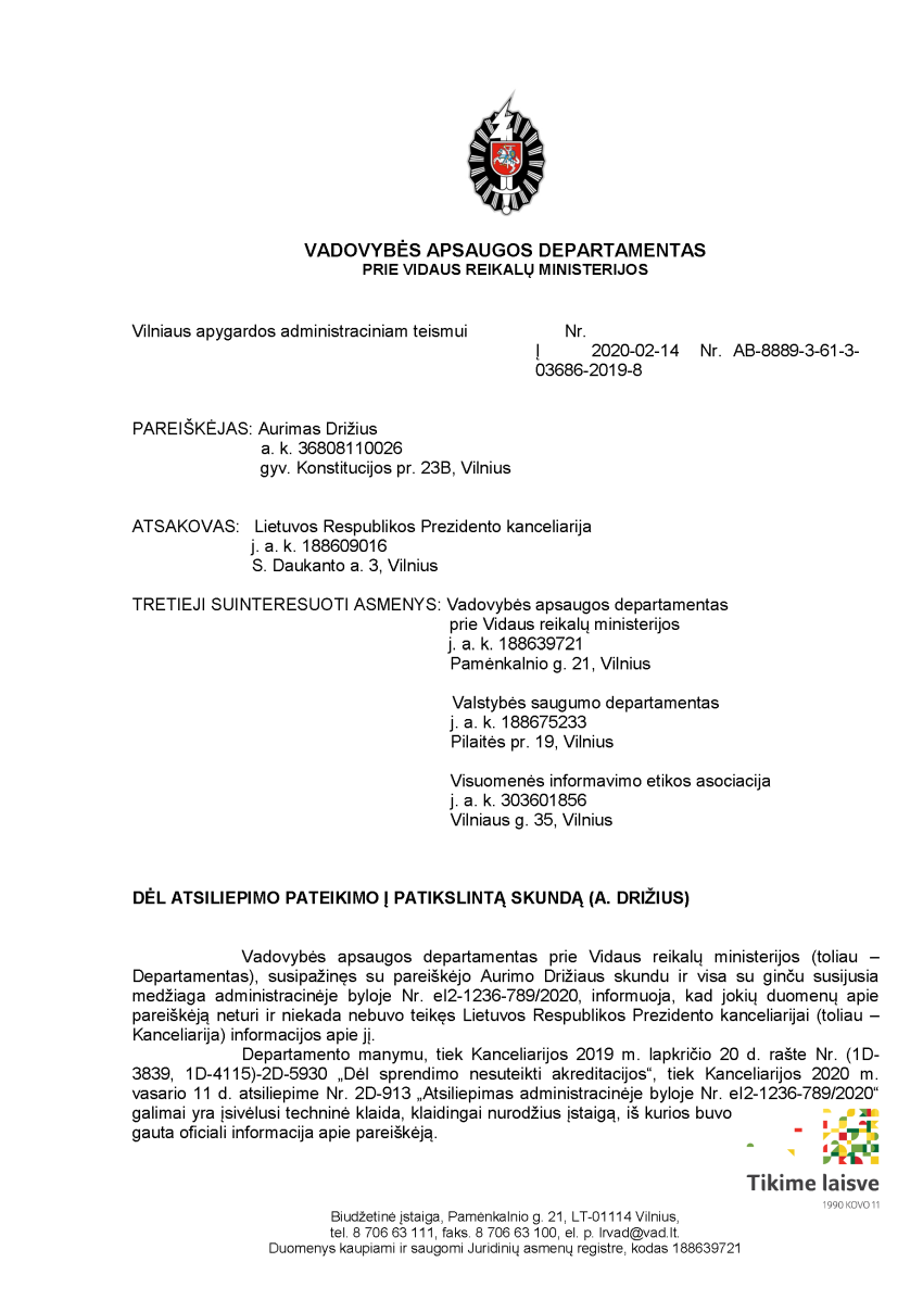 VSD šefas Jauniškis nėrė į krūmus, prašydamas teismo leisti jam ir VSD nedalyvauti šioje byloje, nes ji čia neva nieko dėta, o A. Zabarauko paminėtas Vadovybės apsaugos departamentas rašte teismui atvirai pripažino, kad minėtas A. Zabarausko raštas yra tiesiog jo fantazija: „Vadovybės apsaugos departamentas prie Vidaus reikalų ministerijos (toliau – Departamentas), susipažinęs su pareiškėjo Aurimo Drižiaus skundu ir visa su ginču susijusia medžiaga administracinėje byloje Nr. eI2-1236-789/2020, informuoja, kad jokių duomenų apie pareiškėją neturi ir niekada nebuvo teikęs Lietuvos Respublikos Prezidento kanceliarijai (toliau – Kanceliarija) informacijos apie jį“.
