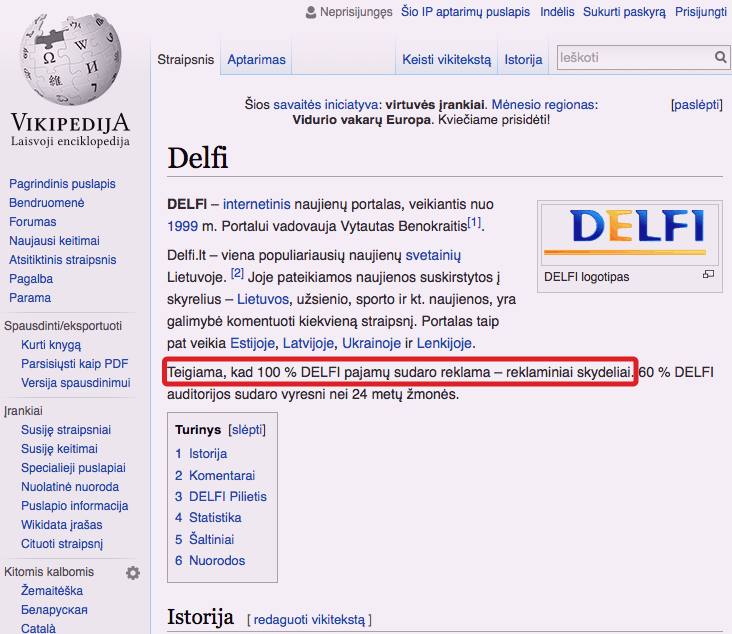 Įdomu pažymėti, kad melagių ir dezinformacijos lyderiu tituluojamas nepriklausomas portalas delfi.lt internetinėje Vikipedijos enciklopedijoje skelbiasi, kad „100 % DELFI pajamų sudaro reklama – reklaminiai skydeliai“.