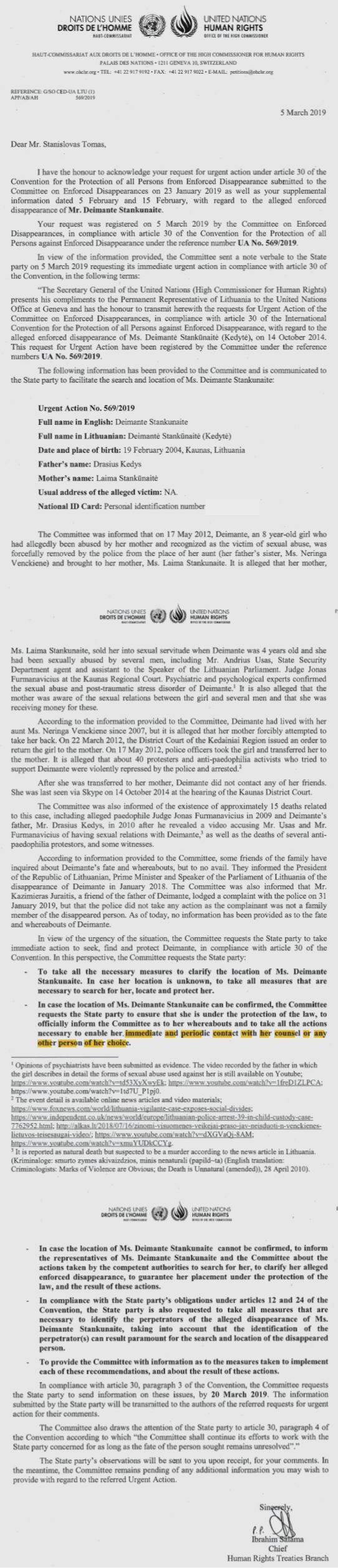 Kai jau buvo skelbta, kovo 5 d. sprendimu Jungtinių Tautų Priverstinių dingimų komitetas (JTPDK) nurodė Lietuvos vyriausybei iki kovo 20 d. pateikti visą reikalingą informaciją apie Deimantę Kedytę ir nedelsiant užtikrinti jai galimybę pasimatyti su jos advokatu Stanislovu Tomu bei su kitais asmenimis, kuriuos ji pasirinktų.