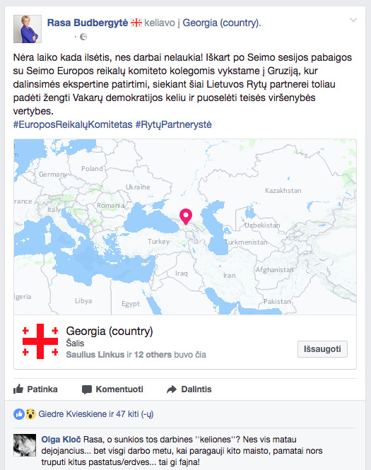 „Nėra laiko kada ilsėtis, nes darbai nelaukia! Iškart po Seimo sesijos pabaigos su Seimo Europos reikalų komiteto kolegomis vykstame į Gruziją, kur dalinsimės ekspertine patirtimi, siekiant šiai Lietuvos Rytų partnerei toliau padėti žengti Vakarų demokratijos keliu ir puoselėti teisės viršenybės vertybes“, - socialiniuose tinkluose visuomenę informavo R. Budbergytė.