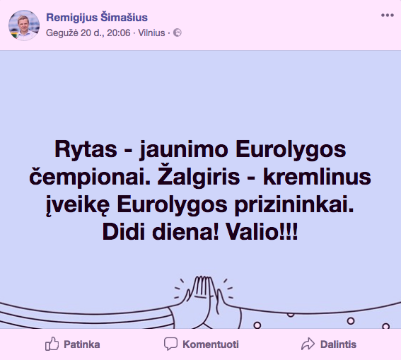 Vilniaus meras, liberalas Remigijus Šimašius po Eurolygoje trečią vietą laimėjusio Kauno „Žalgirio“ pasirodymo bei jaunųjų Vilniaus krepšininkų sėkmės pasidžiaugė šiais pasiekimais ir pasidalino savo sukurtu paveiksliuku.