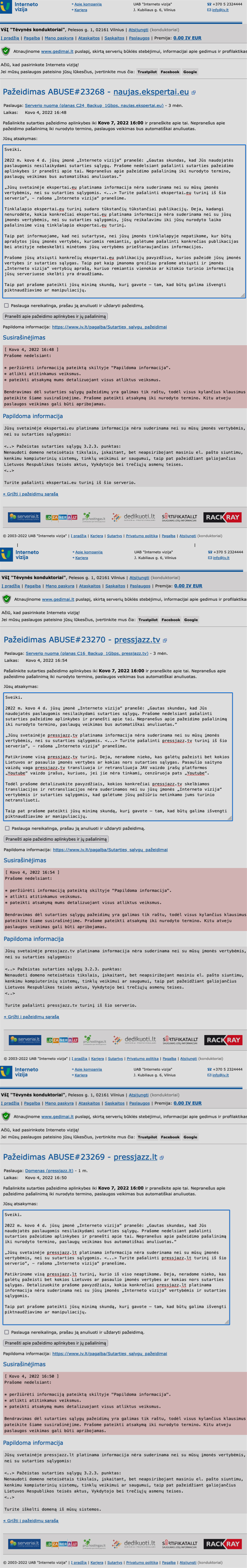„<..> Pažeistas sutarties sąlygų 3.2.3. punktas: Nenaudoti domeno neteisėtais tikslais <..> Turite pašalinti ekspertai.eu turinį iš šio serverio“, - reikalauja „Interneto vizija“.