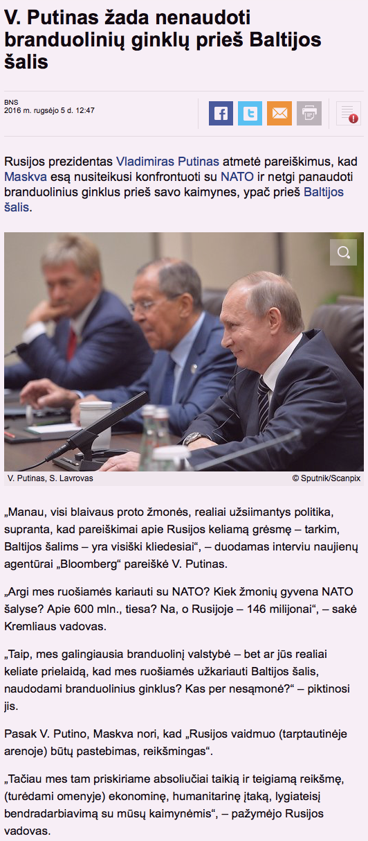 V. Putino interviu „Bloomberg“ – daugiau negu valandos trukmės. Pasižiūrėkime kaip šį interviu pristatė nepriklausomas portalas delfi.lt, garsėjantis savo išskirtinėmis antraštėmis, remdamasis naujienų agentūros BNS informacija.