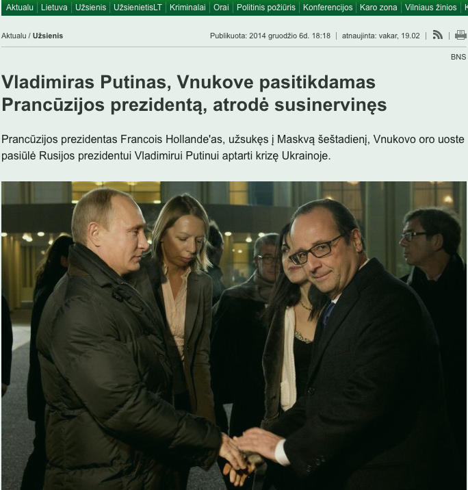 „V. Putinas atrodė susinervinęs, kai pasitiko F.Hollande'ą, grįžtantį į Prancūziją po vizito Kazachstane. Prancūzijos vadovas tapo aukščiausio rango Vakarų šalių lyderiu, apsilankiusiu Rusijoje po kovo mėnesio, kai Maskva aneksavo Ukrainai priklausantį Krymą.“, - skelbia Lietuvos naujienų agentūros ir antrasčių meistras – portalas 15min.lt.