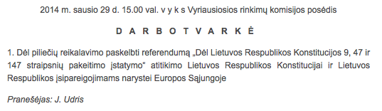 Pastaba: apie 17 val. pasibaigusiame posėdyje VRK atmetė Jono Udrio pateiktą pasiūlymą stabdyti referendumo iniciatyvą. Už tokį sprendimą balsavo 8, prieš – 4, susilaikė 4 VRK nariai. Kaip balsavo konkretūs VRK nariai, paskelbta čia. Šiaip ar taip, žemiau skelbiamos J. Udrio mintys lieka aktualios kaip galimybė susipažinti su dalies VRK narių argumentais bei veikimo metodais.