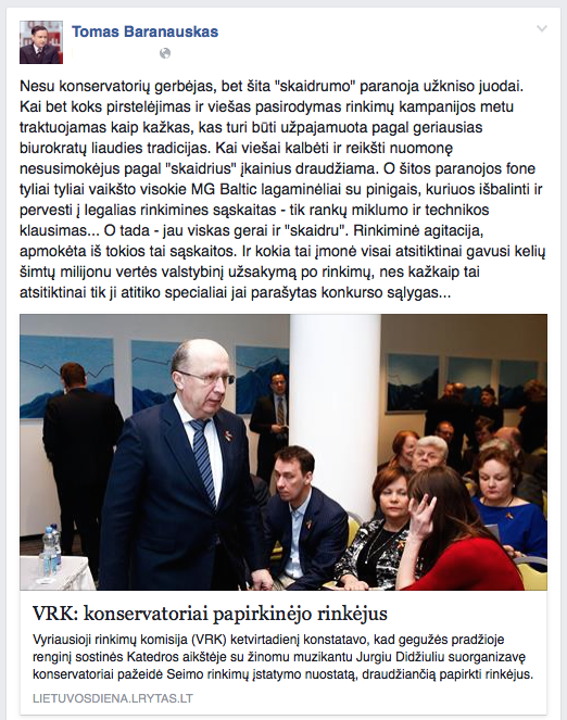 Savo neigiamą požiūrį į VRK sprendimą išsakė ir konservatorių padalinio „Tautininkų sąjunga“ atstovas Tomas Baranauskas, šiuo metu drauge su partija „Tvarka ir teisingumas“ einantis į 2016 m. Seimo rinkimus: