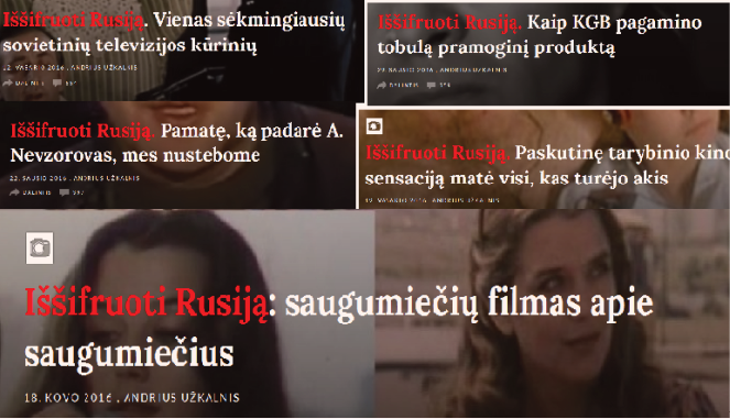 Tas pats naujienų portalas delfi.lt, siekdamas plėsti Rusijos informacinę erdvę Lietuvoje ir platinti mūsų valstybei priešiškas ideologines ir kultūrines nuostatas, 2015 metais pradėjo projektą „Iššifruoti Rusiją“, kuriuo Lietuvos skaitytojams stengiamasi priminti sovietinius laikus ir taip sukelti nostalgiją. Projekto rėmuose skaitytojams pateikiamos sovietinių filmų apžvalgos, primenama sovietinė buitis, taip bandoma atitraukti portalo lankytojus nuo realybės, jie skatinami galvoti apie Rusiją.