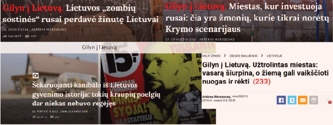 Vykdydamas Rusijos informacinį karą prieš Lietuvą, naujienų portalas delfi.lt naudojo ne tik įrankius, skatinančius sovietinę nostalgiją, bet ir kitus instrumentus. 2015 metais portalas paskelbė seriją rašinių „Gilyn į Rusiją“, kuriuose aprašė gūdžias Rusijos vietas ir ten kylančias problemas. Iš karto po to Monikos Garbačiauskaitės-Budrienės vadovaujama žiniasklaidos priemonė pradėjo projektą „Gilyn į Lietuvą“, kuriuo skaitytojams siekiama sudaryti įspūdį, kad Lietuvoje yra taip pat blogai, kaip ir Rusijoje. Tam parenkami skaitytojus šokiruoti turintys pavadinimai, Lietuva lyginama su Rusija. Šis delfi.lt projektas yra puikus instrumentas Rusijai, siekiančiai vaizduoti Lietuvą kaip atsilikusią, nepasisekusią valstybę, naudojantis Lietuvoje vadinamųjų „naudingų idiotų“ sukurtais tekstais ir pateikiant juos Rusijos auditorijai kaip autentišką realybę.