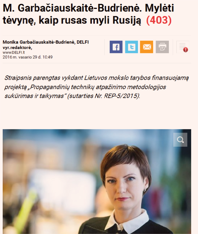 2015 metais portale delfi.lt užfiksuotos informacinės atakos rodo, kad portalo bendradarbiai tobulėja ir naudoja naujas priemones informaciniame kare prieš Lietuvą. Antai portalo vyriausioji redaktorė Monika Garbačiauskaitė-Budrienė portale pradėjo skelbti Lietuvos Mokslo Tarybos apmokamus komentarus, kuriais neva yra kuriama propagandos atpažinimo metodologija. Tokiu būdu Lietuvos skaitytojams bandoma sudaryti įspūdį, jog Lietuvos žiniasklaida niekuo nesiskiria nuo Rusijos žiniasklaidos ir kad mūsų valstybėje, kaip ir Rusijoje, žurnalistus galima užsakyti. Taip ne tik kompromituojama konkreti žiniasklaidos priemonė, bet ir mažinamas pasitikėjimas visa Lietuvos žiniasklaida kaip būtinu demokratijos institutu.