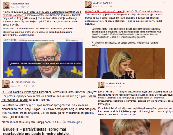 Šis asmuo socialiniuose tinkluose nuolat skelbia įrašus, kuriuose niekinamai atsiliepia apie aukščiausius Europos Sąjungos politikus, taip siekdamas sumenkinti Europos Sąjungą ir Lietuvos narystę šioje organizacijoje. Be to, A.Bačiulis ypač radikaliai ir niekinamai pasisako apie ES pabėgėlių politiką bei nuolat naudoja užgaulius epitetus kitų tautybių ES piliečių atžvilgiu. Tokia jo veikla visiškai atitinka Kremliaus tikslus pristatyti ES kaip neveiklią organizaciją ir priversti Lietuvos gyventojus abejoti narystės ES nauda.