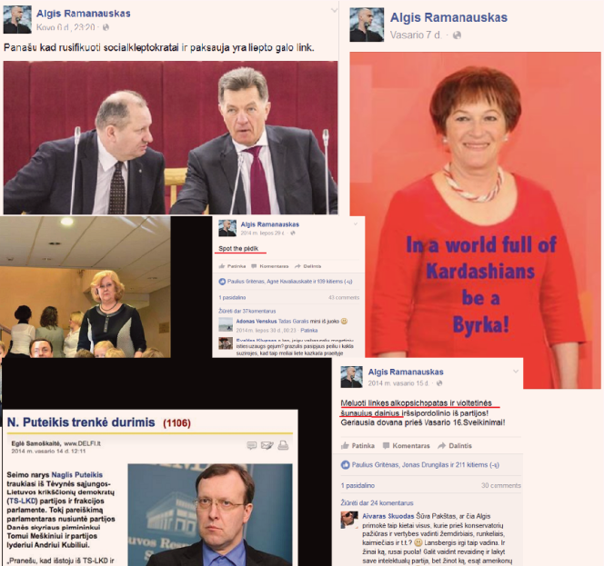 Nerimą kelia ir kai kurių politikų, dažniausiai priklausančių TS-LKD nuolatinės pastangos platinti socialiniuose tinkluose rusiškos žiniasklaidos tekstus bei Rusijos televizijos reportažus. Tai daroma prisidengiant tuo, kad Lietuvos gyventojai turi žinoti, kas yra rašoma ir rodoma Rusijoje, tačiau iš tiesų propagandinių tekstų ir videosiužetų platintojai turi tikslą kuo plačiau paskleisti Lietuvoje Kremliaus propagandą. Ypač tuo pasižymi Seimo nariai Rasa Juknevičienė ir Mantas Adomėnas bei Liberalų sąjūdžio atstovas Tomas Danilevičius. Visus juos departamentas aktyviai stebi ir, esant reikalui, imsis atitinkamų preventyvių priemonių.