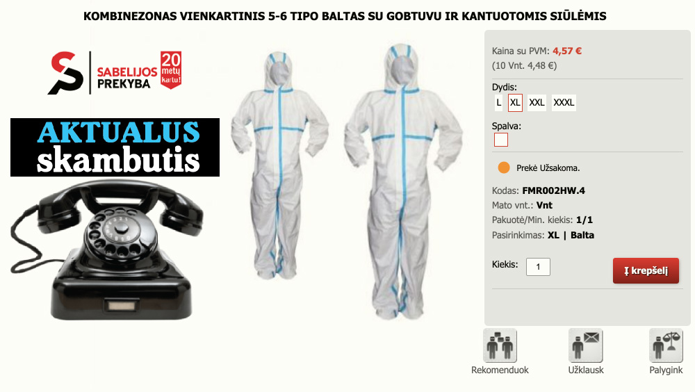 Ekspertai.eu pasidomėjo, ar būtų įmanoma ir per kiek laiko galima įsigyti, pavyzdžiui, vienkartinio naudojimo kombinezoną – su gobtuvu ir kantuotomis siūlėmis, kurio vieneto kaina apie 5 eurus.