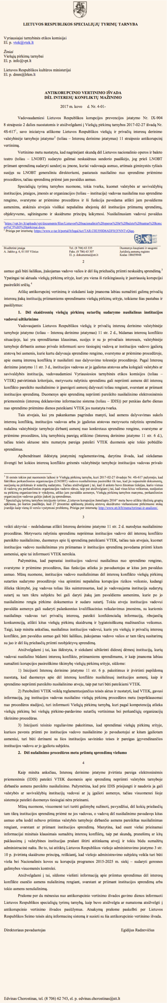Kovo 27 d. STT atstovė paaiškino, kad STT tokią kritiką G. Kėvišui pareiškė kovo 6 d. Vyriausiajai tarnybinės etikos komisijai, Viešųjų pirkimų tarnybai, Lietuvos Respublikos kultūros ministerijai skirtame rašte „ANTIKORUPCINIO VERTINIMO IŠVADA DĖL INTERESŲ KONFLIKTŲ MAŽINIMO“.