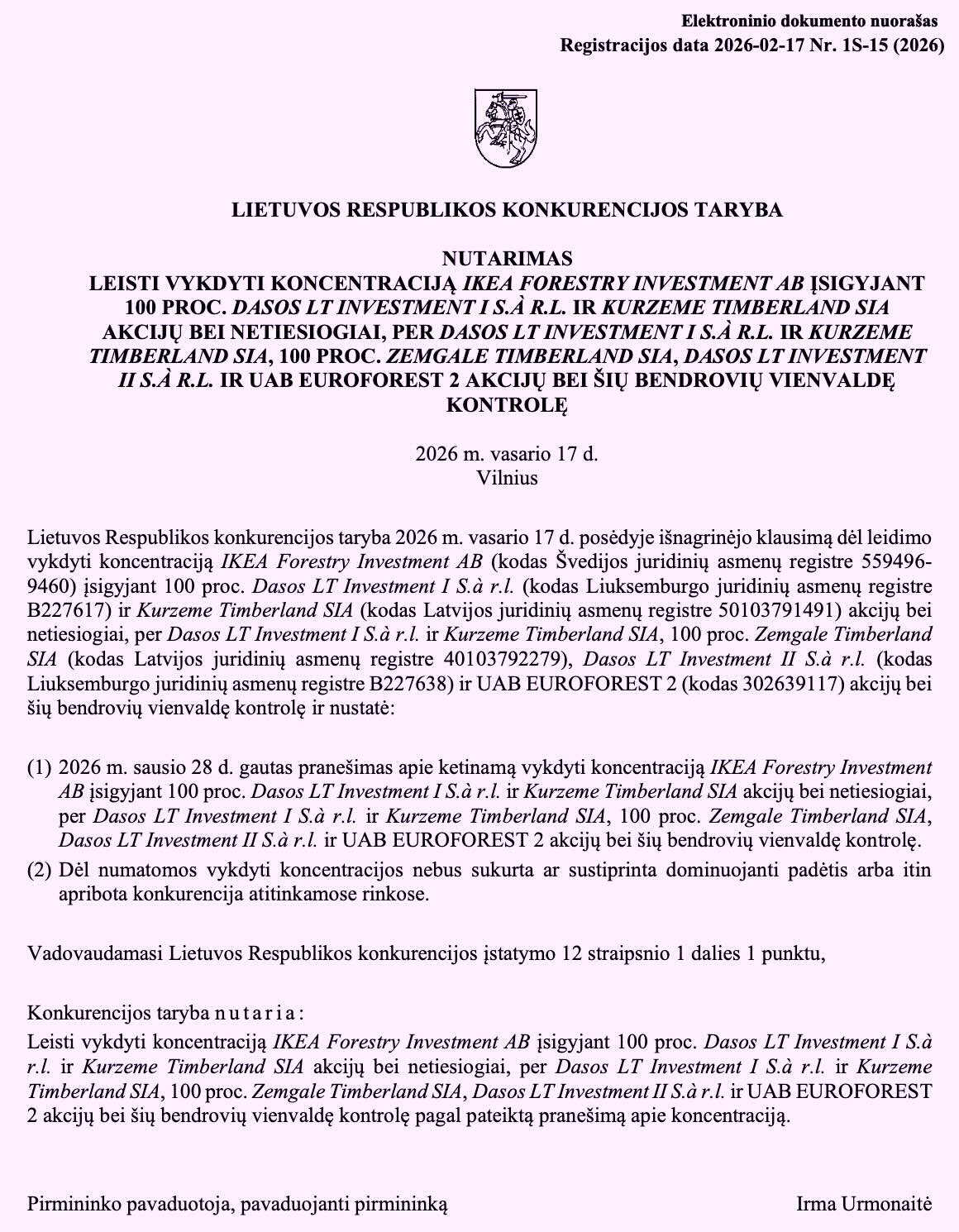 2026 m. vasario 17 d. Lietuvos Respublikos konkurencijos taryba leido „IKEA Forestry Investment“ vykdyti koncentraciją ir perimti susijusių bendrovių kontrolę, tarp jų – ir netiesioginę „Euroforest 2“ kontrolę. Kitaip tariant, formaliai buvo perkamos ne miško žemės bylos, o įmonės.