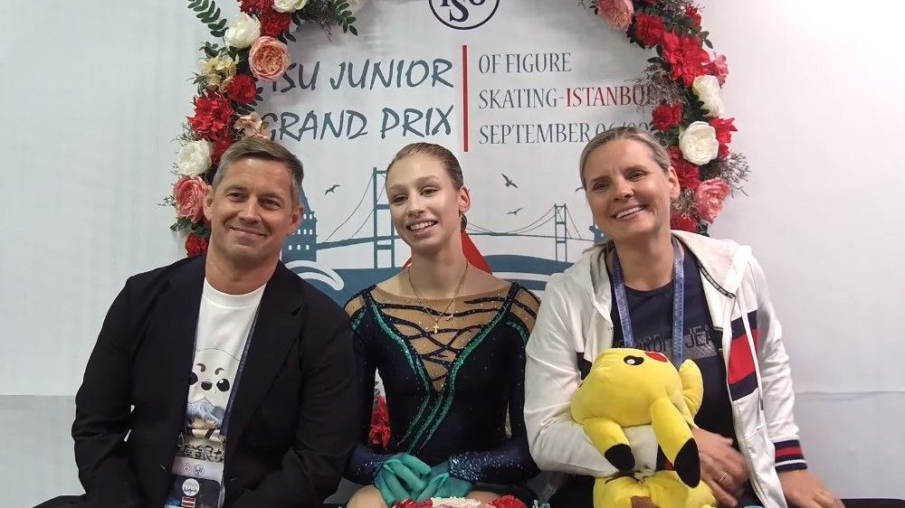 Sofija Stepčenko (centre) su savo buvusiais treneriais Raimo Reinsalu (kairėje) ir Olga Kovaljkova, kuriuos ji apkaltino fiziniu ir emociniu smurtu.