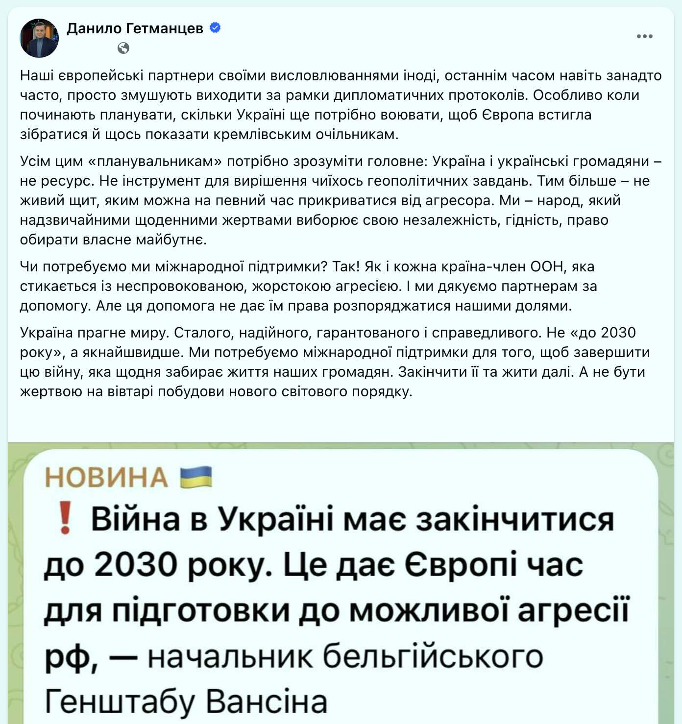 Ukraina siekia taikos. Tvaraus, patikimo, garantuoto ir teisingo. Ne „iki 2030 m.“, o kuo greičiau. Mums reikalinga tarptautinė parama, kad galėtume užbaigti šį karą, kuris kasdien atima mūsų piliečių gyvybes. Užbaigti jį ir gyventi toliau. O ne būti auka ant naujos pasaulio tvarkos kūrimo altoriaus“, - visuomeniniuose tinkluose paskelbė D. Getmancevas.