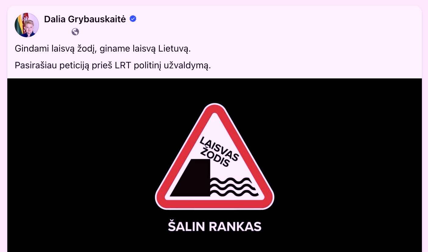 Kovo 11-osios nepriklausomybės priešininkė, Mykolo Burokevičiaus bendražygė, po Nepriklausomybės Akto paskelbimo drauge su šiuo komunistu plušėjusi Lietuvos nepriklausomybės priešininkų pusėje, oficiali Rusijos Federacijos valstybės paslaptis, savo biografijos klastotoja, aktyvi sukilusių Lietuvos kultūrininkų prietelka, prezidentė Dalia Grybauskaitė visuomeniniuose tinkluose pranešė, kad pasirašė peticiją „prieš LRT politinį užvaldymą“.