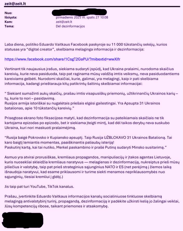 Žurnalistų etikos inspektoriaus tarnyba (ŽEIT) pranešė, kad „Žurnalistų etikos inspektorius pradėjo tyrimą savo iniciatyva pagal pareiškėjo skundą (registracijos Žurnalistų etikos inspektoriaus tarnyboje Nr. SK-452, 2025) dėl socialinio tinklo Facebook paskyroje „Eduardas Vaitkus“ paskelbtos informacijos.