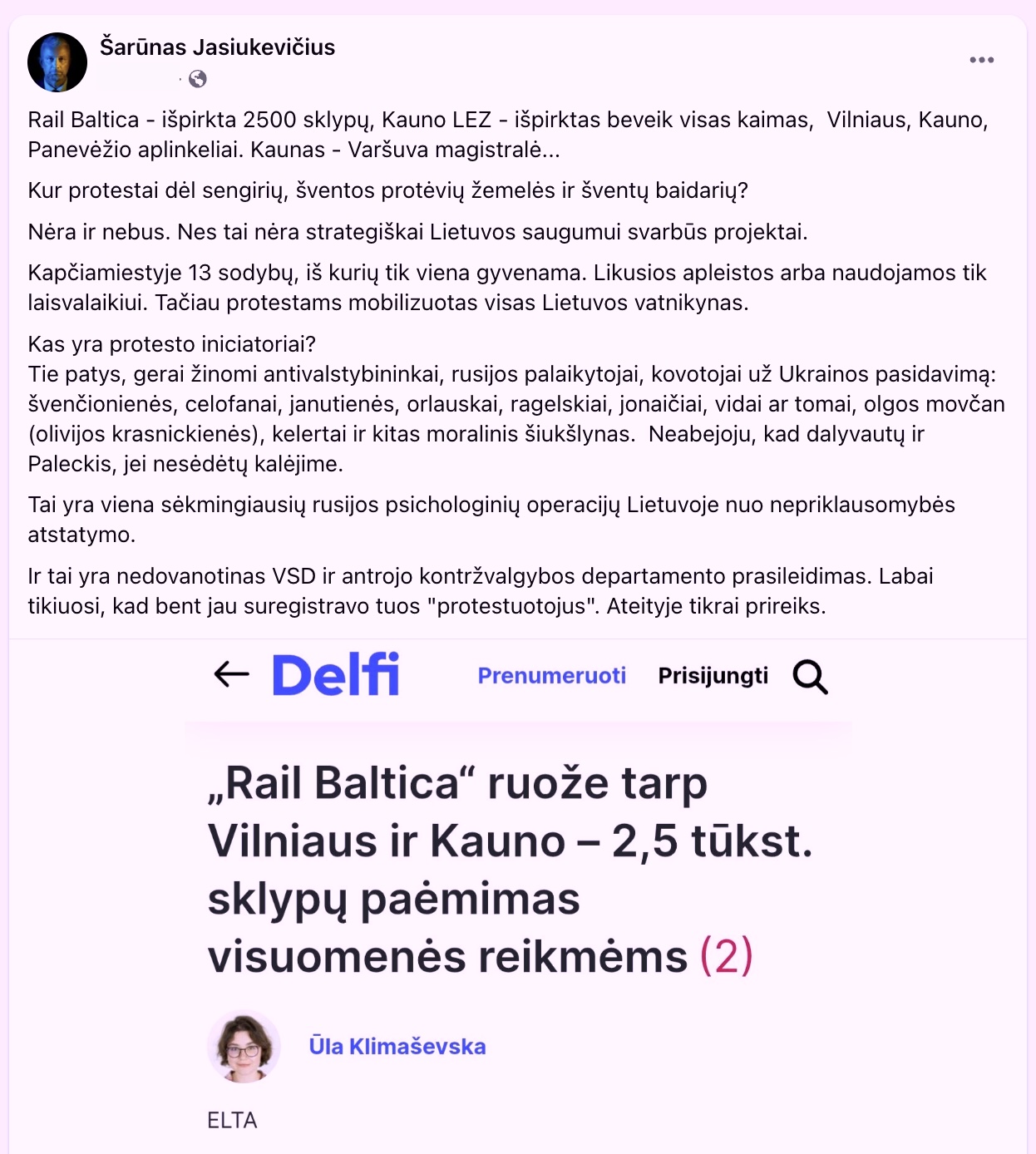 „Rail Baltica – išpirkta 2500 sklypų, Kauno LEZ – išpirktas beveik visas kaimas, Vilniaus, Kauno, Panevėžio aplinkeliai. Kaunas – Varšuva magistralė... Kur protestai dėl sengirių, šventos protėvių žemelės ir šventų baidarių? Nėra ir nebus. Nes tai nėra strategiškai Lietuvos saugumui svarbūs projektai“, - į savo klausimą atsakymą pateikė Š. Jasiukevičius.