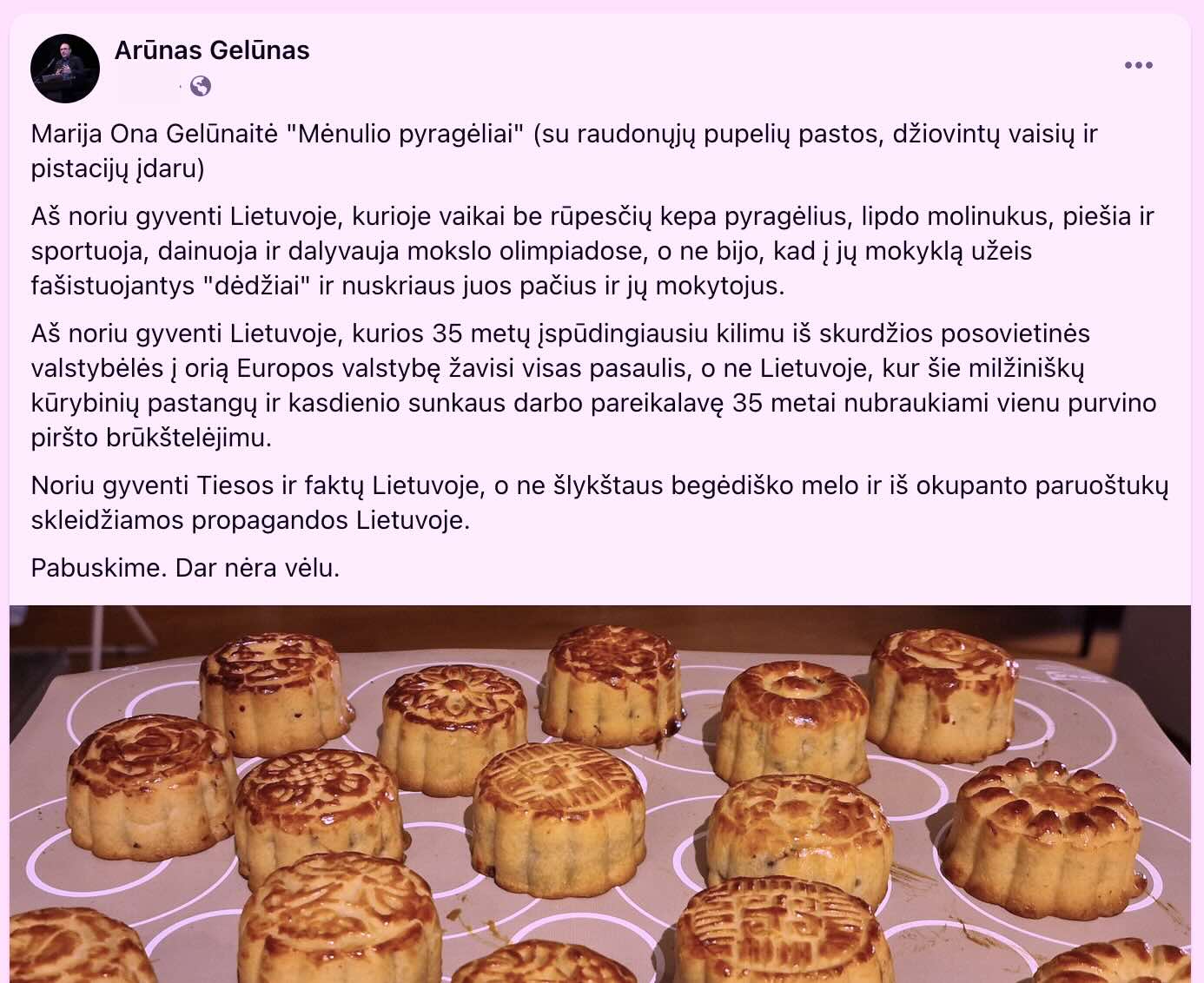Aš noriu gyventi Lietuvoje, kurioje vaikai be rūpesčių kepa pyragėlius, lipdo molinukus, piešia ir sportuoja, dainuoja ir dalyvauja mokslo olimpiadose, o ne bijo, kad į jų mokyklą užeis fašistuojantys "dėdžiai" ir nuskriaus juos pačius ir jų mokytojus. Aš noriu gyventi Lietuvoje, kurios 35 metų įspūdingiausiu kilimu iš skurdžios posovietinės valstybėlės į orią Europos valstybę žavisi visas pasaulis, o ne Lietuvoje, kur šie milžiniškų kūrybinių pastangų ir kasdienio sunkaus darbo pareikalavę 35 metai nubraukiami vienu purvino piršto brūkštelėjimu. Noriu gyventi Tiesos ir faktų Lietuvoje, o ne šlykštaus begėdiško melo ir iš okupanto paruoštukų skleidžiamos propagandos Lietuvoje. Pabuskime. Dar nėra vėlu“, - visuomeniniuose tinkluose paskelbė A. Gelūnas.