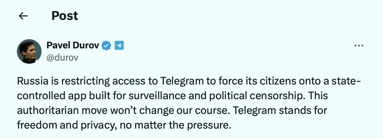 Šioje vietoje mūsų šalį aplenkė Rusija, kuri jau pradėjo TELEGRAM blokavimą, lėtinamas programėlės darbas, nes esą nesilaikoma Rusijos įstatymų.