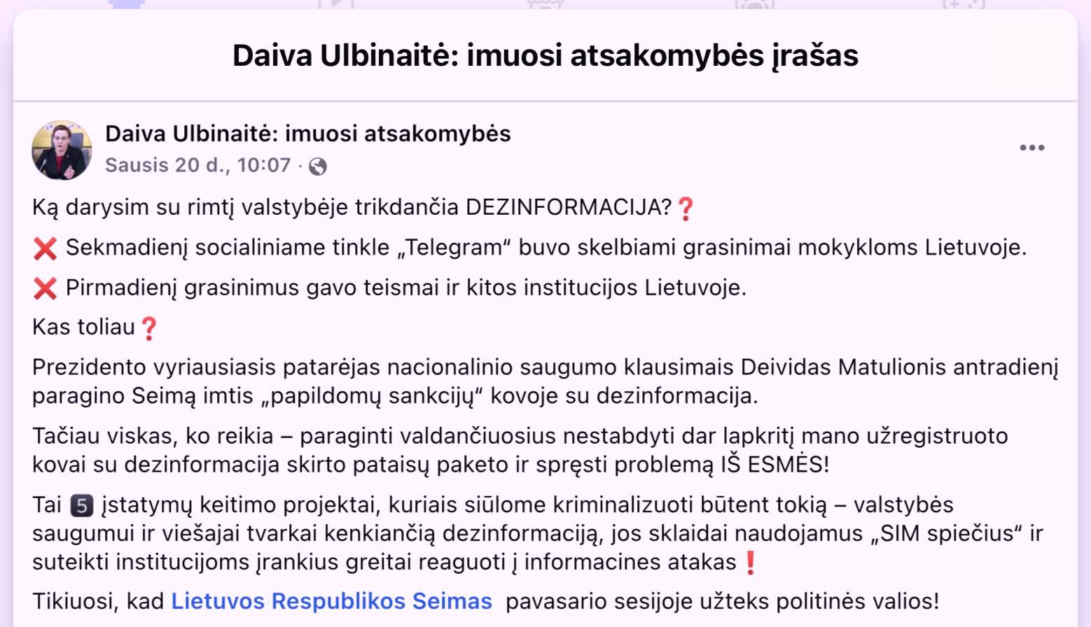 Ekspertai.eu primena, kad apie TELEGRAM grėsmę mūsų šaliai yra ne kartą perspėjusi ir Landsbergių partijos bei Seimo narė, kovos su priešo dezinformacija flagmanas Lietuvoje Daiva Ulbinaitė.