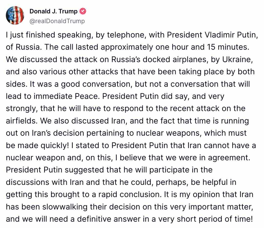 JAV prezidentas Donald Trump telefonu kalbėjosi su Rusijos prezidentu Vladimiru Putinu po plataus masto Ukrainos dronų atakos prieš Rusijos oro pajėgų bazes. Pokalbis truko 1 val. 15 min. Apie tai tinkle TRUTH pranešė pats D. Trump.