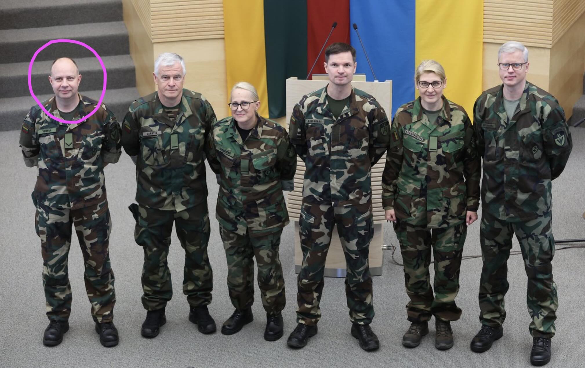 | Žalijų valstiečių lyderis, šaulys Aurelijus Veryga (galvutė apibraukta violetiniu apskritimu), šiuo metu esantis relaksacijos etape Europos Parlamente. |