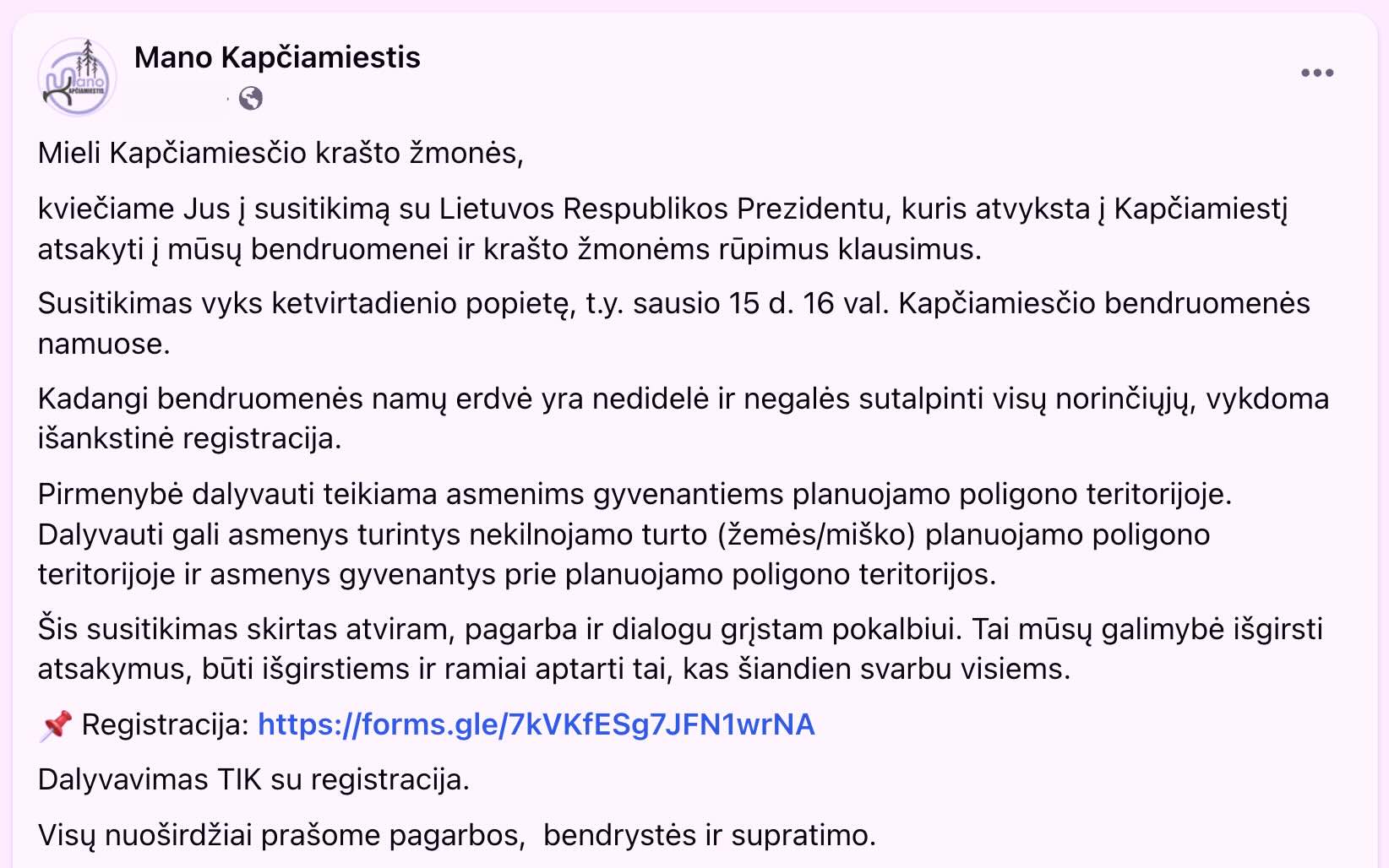O štai taip atrodo bendruomenės „Mano Kapčiamiestis“ pranešimas: