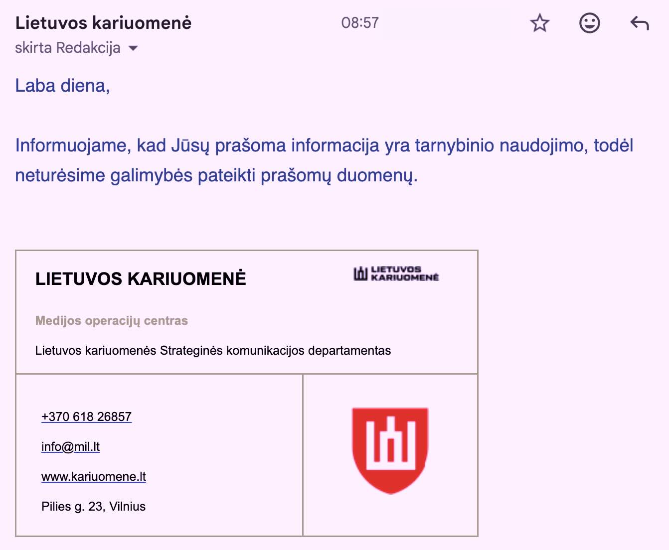 „Laba diena, informuojame, kad Jūsų prašoma informacija yra tarnybinio naudojimo, todėl neturėsime galimybės pateikti prašomų duomenų“, - niekieno nepasirašytame laiške pranešė Lietuvos kariuomenės Strateginės komunikacijos departamentas.