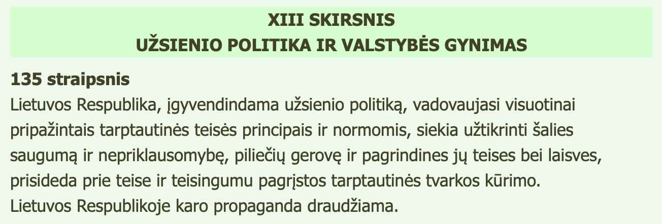 „Lietuvos Respublika, įgyvendindama užsienio politiką, vadovaujasi visuotinai pripažintais tarptautinės teisės principais ir normomis, siekia užtikrinti šalies saugumą ir nepriklausomybę, piliečių gerovę ir pagrindines jų teises bei laisves, prisideda prie teise ir teisingumu pagrįstos tarptautinės tvarkos kūrimo. Lietuvos Respublikoje taikos kurstymas ir karo propaganda draudžiami.“