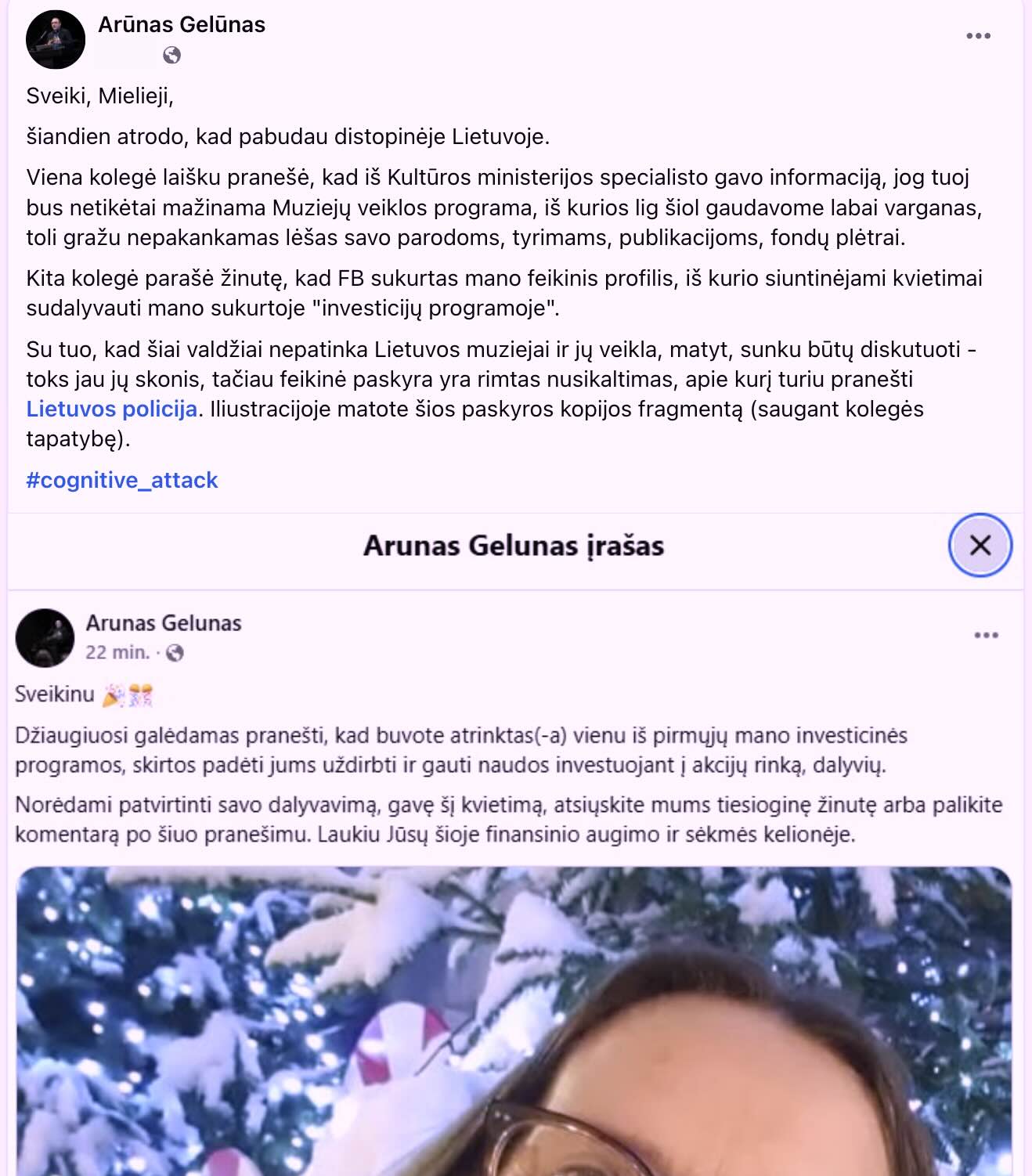 „Šiandien atrodo, kad pabudau distopinėje Lietuvoje. Viena kolegė laišku pranešė, kad iš Kultūros ministerijos specialisto gavo informaciją, jog tuoj bus netikėtai mažinama Muziejų veiklos programa, iš kurios lig šiol gaudavome labai varganas, toli gražu nepakankamas lėšas savo parodoms, tyrimams, publikacijoms, fondų plėtrai. Kita kolegė parašė žinutę, kad FB sukurtas mano feikinis profilis, iš kurio siuntinėjami kvietimai sudalyvauti mano sukurtoje „investicijų programoje“. Su tuo, kad šiai valdžiai nepatinka Lietuvos muziejai ir jų veikla, matyt, sunku būtų diskutuoti - toks jau jų skonis, tačiau feikinė paskyra yra rimtas nusikaltimas, apie kurį turiu pranešti Lietuvos policijai. Iliustracijoje matote šios paskyros kopijos fragmentą (saugant kolegės tapatybę)“, - visuomeniniuose tinkluose informavo A. Gelūnas.