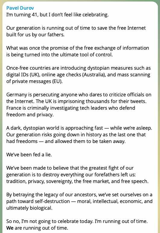 Niekada nebuvo jokio "laisvo" interneto, tiesiog ji buvo maziau varzomas. Durovas kalbedamas apie tai, manau turi omeny Telegramm, bet tai nera internetas, tai tik interneto vartotojas. Juolab, ir Telegramm nera ir nebuvo "laisvas", tai neimanoma.