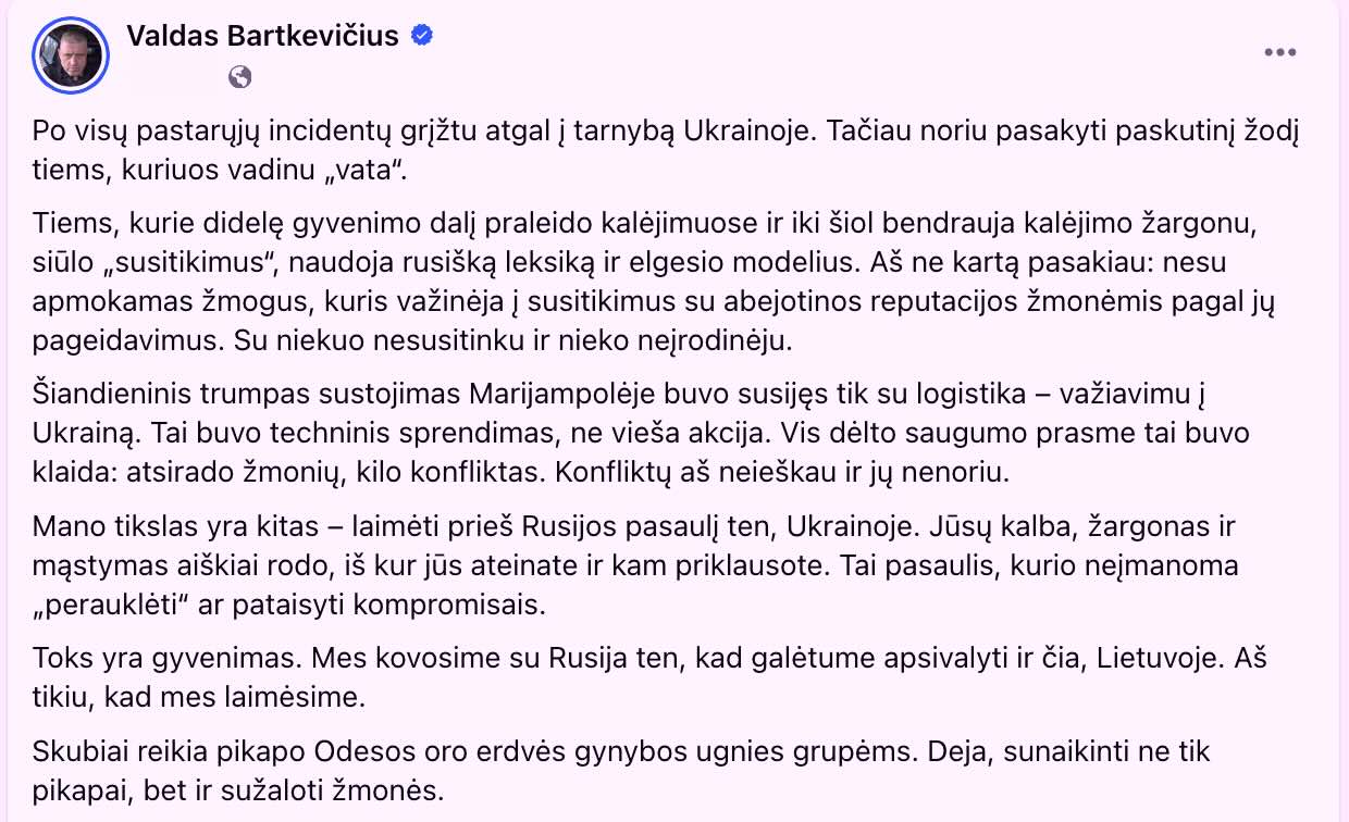 Landsbergių partijos bei Seimo narės Jurgitos Sejonienės visuomeninis konsultantas Valdas Bartkevičius informavo, kad po visų pastarųjų incidentų grįžta atgal į tarnybą Ukrainoje.