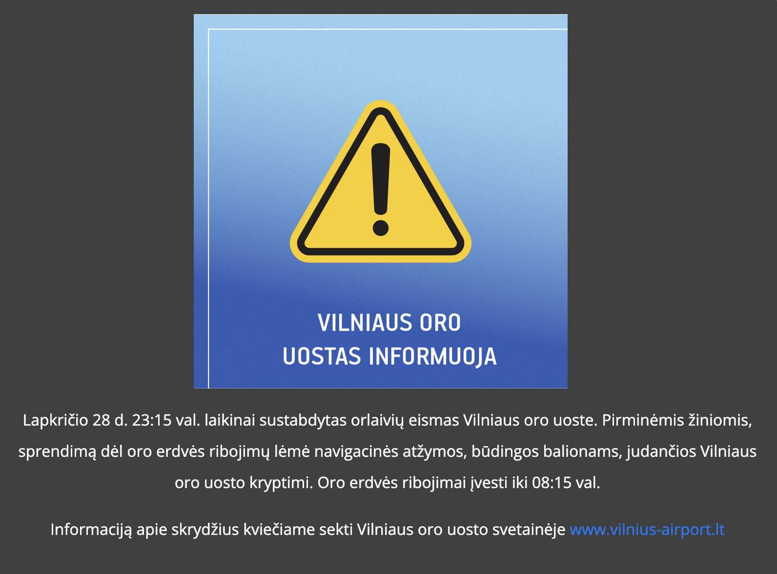Vilniaus oro uostas skelbia: „Lapkričio 28 d. 23:15 val. laikinai sustabdytas orlaivių eismas Vilniaus oro uoste. Pirminėmis žiniomis, sprendimą dėl oro erdvės ribojimų lėmė navigacinės atžymos, būdingos balionams, judančios Vilniaus oro uosto kryptimi. Oro erdvės ribojimai įvesti iki 08:15 val.“